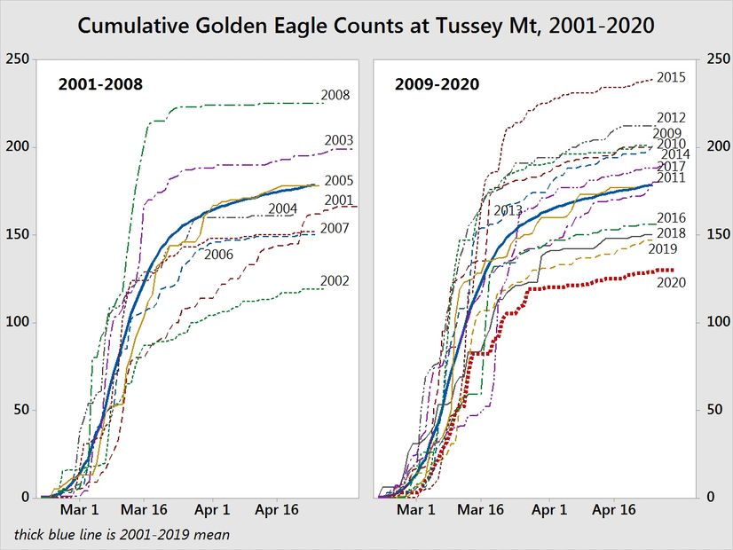 Fall raptor flights have been known to occur on Tussey Mountain for many years, with the former fire tower near Pennsylvania Furnace Rd, about 5 miles southwest of our count site, being a popular watch site (see Merrill Wood's classic Birds of Pennsylvania), as well as the Colerain Road near Spruce Creek. Part-time spring counts were begun by David Brandes in March 1995 and continued through 2000 with the help of Dan Ombalski, Nick Bolgiano, Chuck Widmann and other local die-hards. Full-time counts have been conducted from late Feb through April since 2001. Although conventional wisdom maintained that raptors do not follow ridges in the spring, we learned quickly that this did not apply to early season golden eagles.